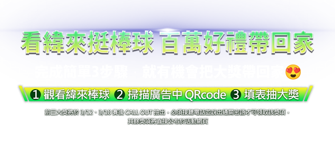 【1】收看緯來體育台棒球賽事【2】於廣告期間掃描 QR Code【3】完成表單 即可參加活動