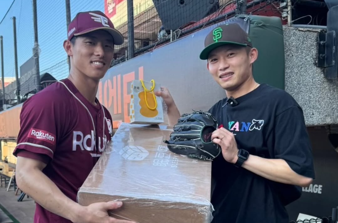 而今天交流賽前,江國豪也特別來到現場與「網友」辰己見面,並送上枕頭以及台灣名產鳳梨酥,兩人也在場邊合影留念。