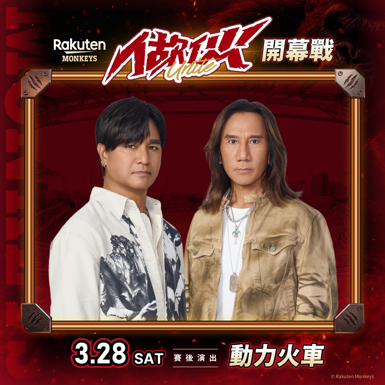 3月28日(六)開幕戰,賽前舞台將由桃猿好朋友周自從 & My Bro大樂隊率先登場,他們將用熟悉的年度主題曲《READY》、《BREAKTHROUGH》以及《NONSTOP》喚醒10號隊友的熱血回憶,並首度演唱全新年度主題曲《做伙》,以搖滾點燃全場,為大巨蛋開幕戰揭開最沸騰的序章。緊接登場的金曲歌后ABAO阿爆feat.那屋瓦少女隊、阿拉斯、R.fu,將攜手樂天女孩、樂天應援團「猴系因仔」、吉祥物猿氣與大聖,共同打造樂天嘉年華。賽後,戴愛玲與動力火車接棒開唱,以穿透力十足的歌聲與充滿能量的表演,將開幕夜的氣氛推向高潮。