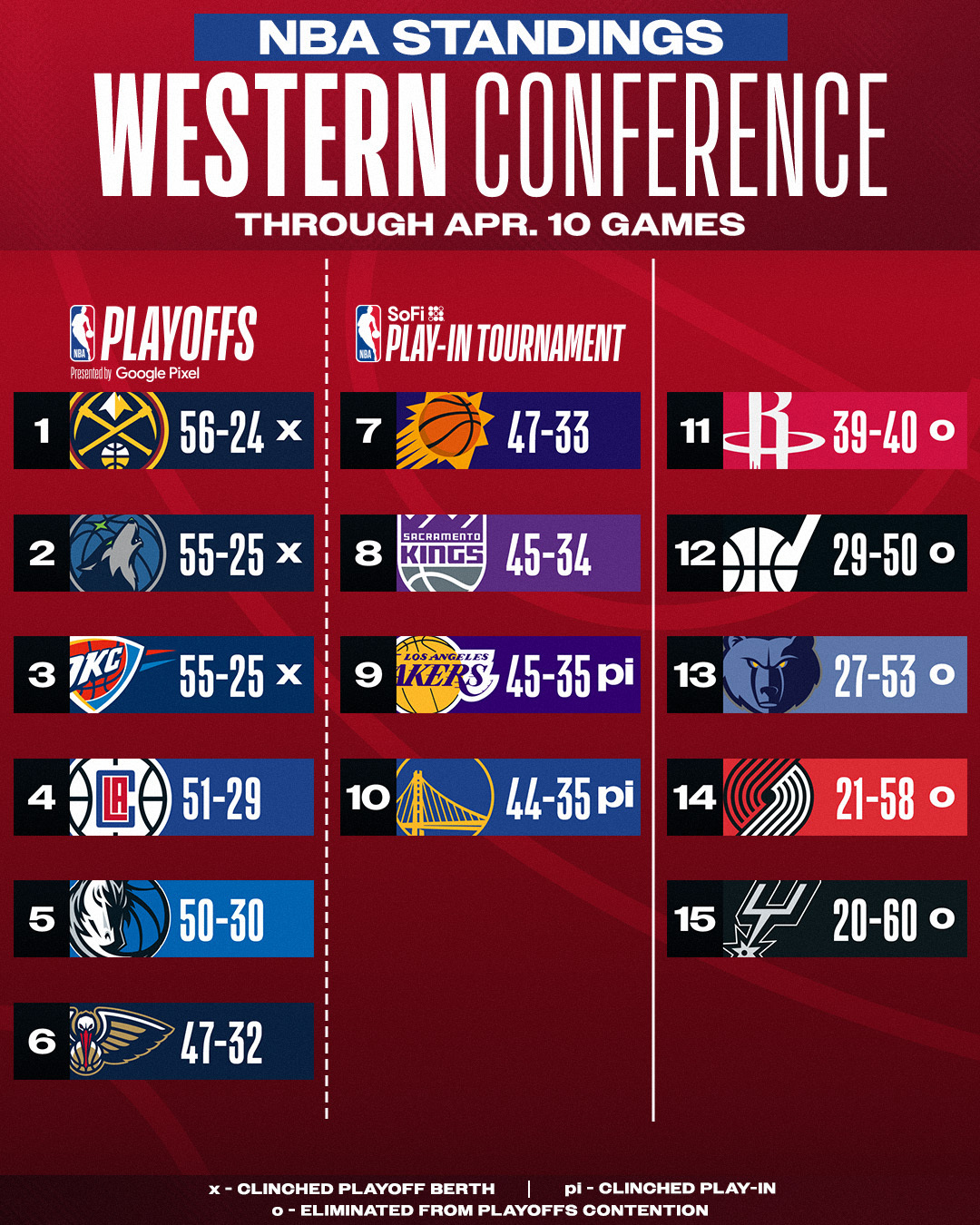 NBA例行賽來到尾聲,東西區附加賽卡位戰況激烈,西區6到10名以及東區4到8名都只有3場勝差,附加賽組合以及主客場都可能出現極大變動。