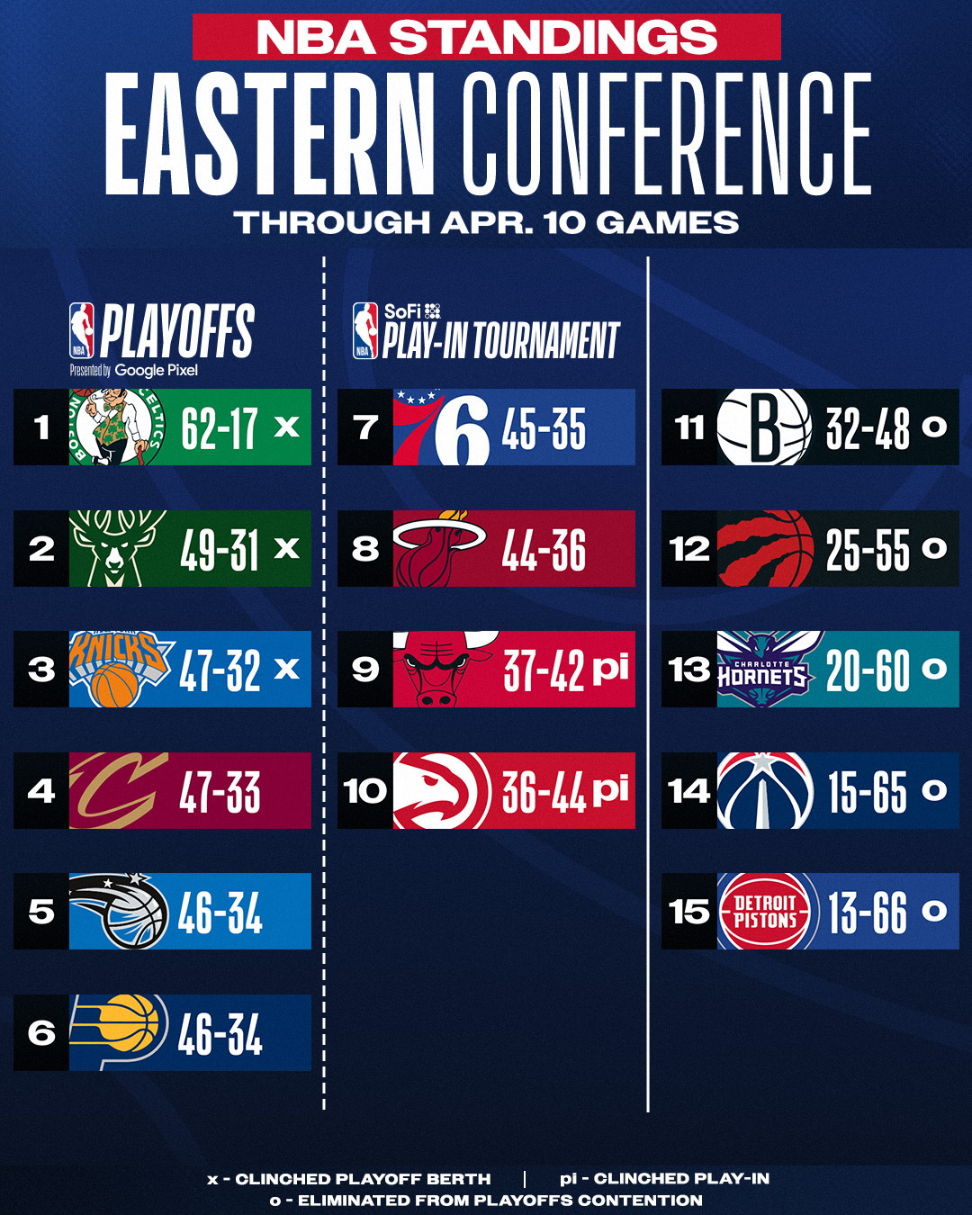 而東區第10的老鷹輸球後,落後第9名的公牛1.5場勝差,老鷹必須接下來2場比賽都贏球,而且公牛2戰皆輸才能登上第9名,獲得附加賽首戰主場優勢。