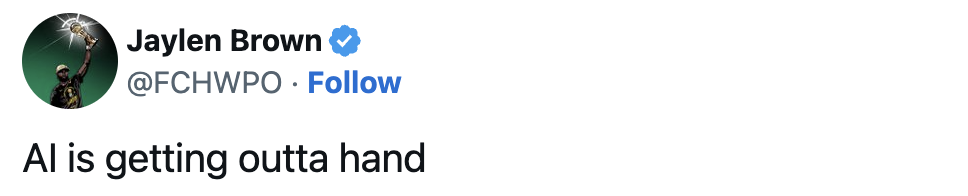 對此,Brown賽後也親自在社群平台X(前Twitter)幽默回應,「AI is getting outta hand(AI真是越來越誇張了)」,展現他一貫的自嘲風格,笑看外界調侃。