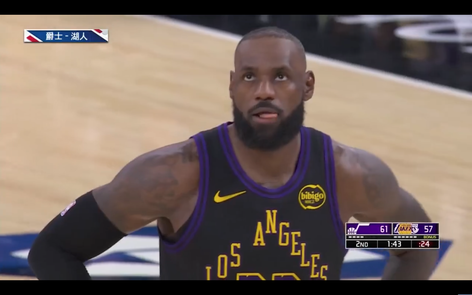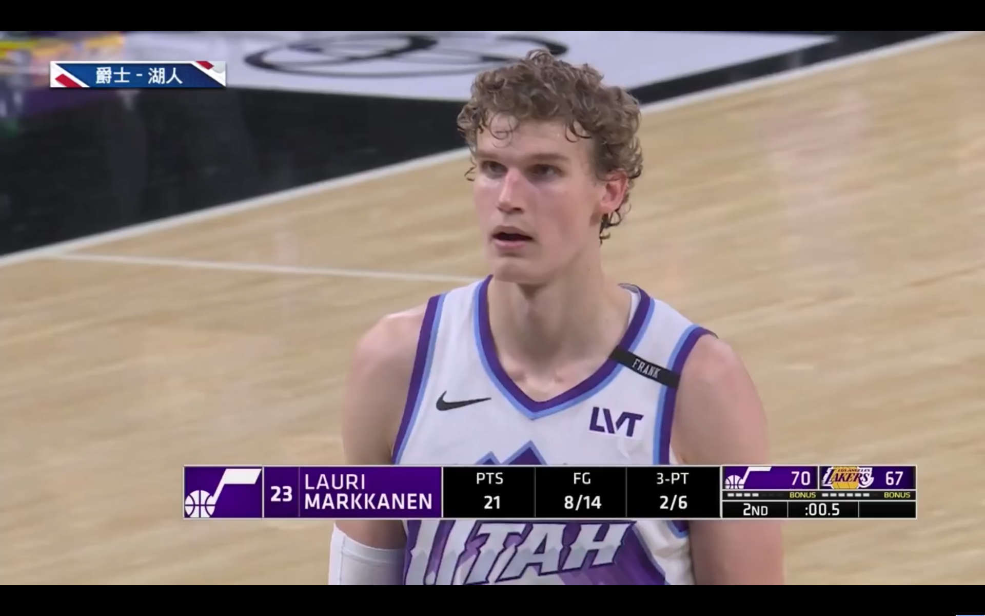 不過在次節後段Doncic挺身而出連續得分將比數給追到4分差,節末James在左側45度角再來一發三分球,以2561記超越Reggie Miller站上歷史排行榜第6位。接著Austin Reaves在中場前18.8秒在右側45度角飆進外線又買到犯規,一舉將比數給追平。想不到Markkanen回頭也回敬一次四分打,幫助爵士在帶著4分領先進入中場。