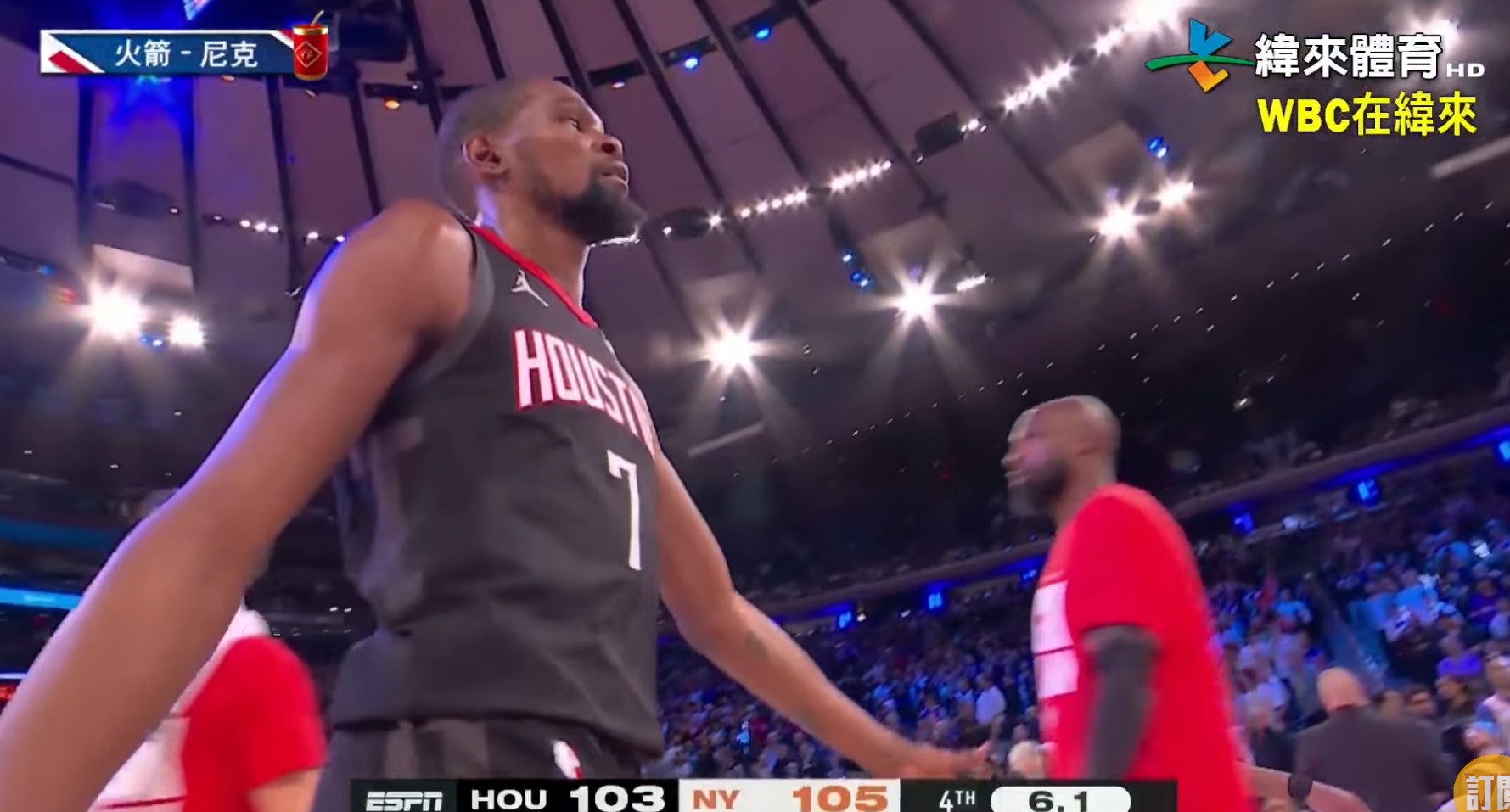 比賽前段,火箭在Amen Thompson飛扣開張之後,整體狀態不算太好,特別是死神Durant,前6次出手全部打鐵。反倒尼克開局一波15比6的攻勢迅速搶佔主動權。不過迅速喊出暫停後,火箭調整有成,手趕回暖蠶食分差。但局勢上仍然被動,一直扮演追分角色,進入半場休息前才迎來爆發,打出一波18比7的攻勢一舉反超,帶著1分領先進入下半場。