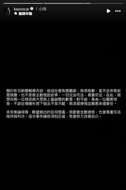 關於昨日新聞報導內容,造成社會負面觀感,我很抱歉,當天並非我故意挑釁,也不是我主動發起紛爭,一切交由司法,尊重司法。在此我想向每一位球迷與大眾致上最誠摯的歉意。對不起,身為一位職業球員,不該在情緒失控下做出不良示範,我深感懊悔並願意承擔責任。