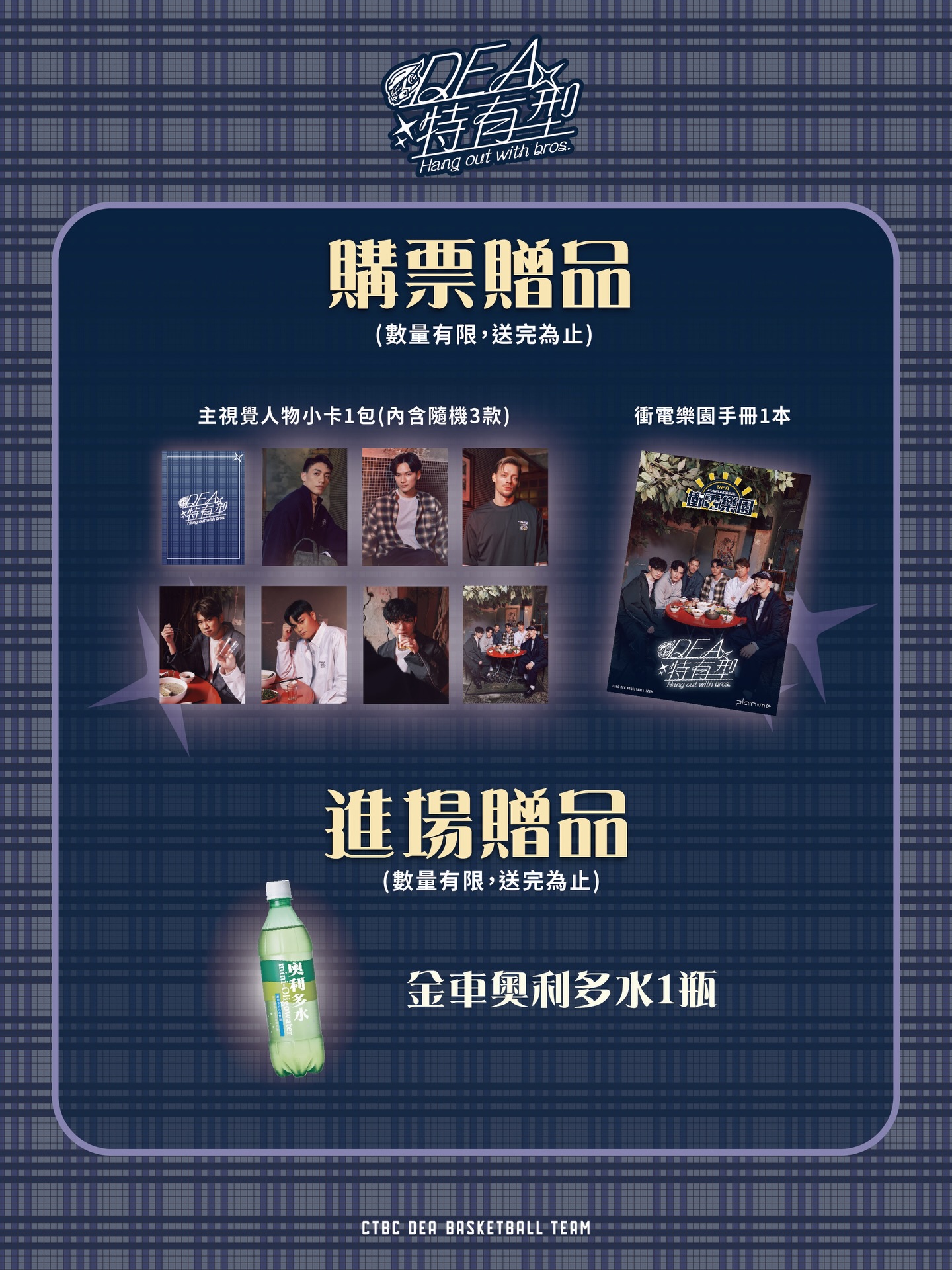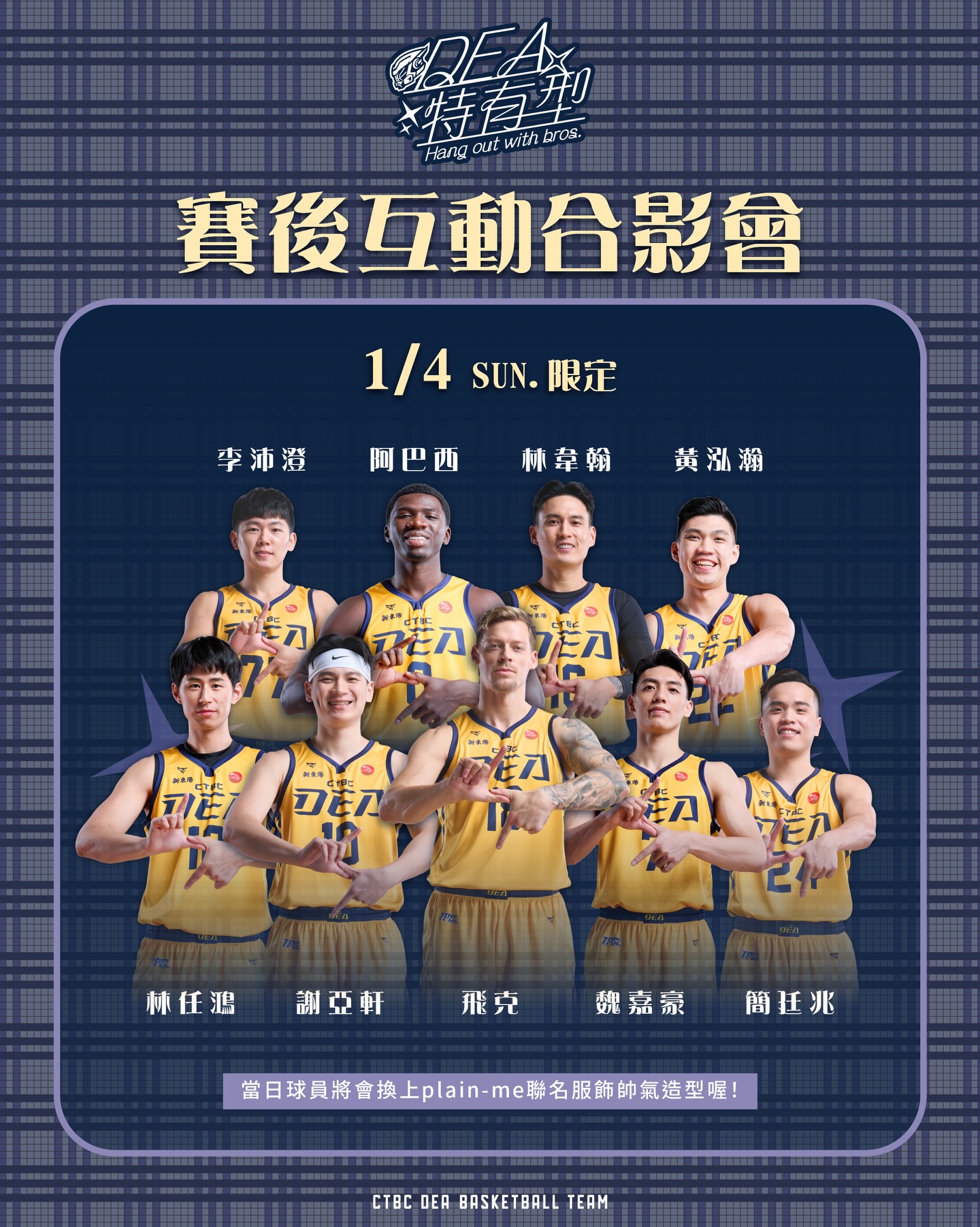 凡先前已購買「DEA特有型主題週-球員合影會三日套票」的球迷朋友,可一次擁有賽事門票、飲品暢飲及球員互動合影的好康!12/31跨年夜推出限定暢飲活動,開放「DYNAMO季票會員」、「DYNAMO一般會員(限100名)」及購買「球員合影會三日套票」的球迷朋友,當日賽前更將舉辦「特會喝PK賽」,邀請特會喝的線人們前來一較高下,優勝者還可以把獎品帶回家!球員互動合影會則將於1/4賽後舉辦,最帥外援-飛克將與阿巴西、魏嘉豪、謝亞軒、林任鴻、林韋翰、黃泓瀚、李沛澄、簡廷兆等9位球員,一同換上此次聯名服飾帥氣亮相,與線人們近距離互動及合影!