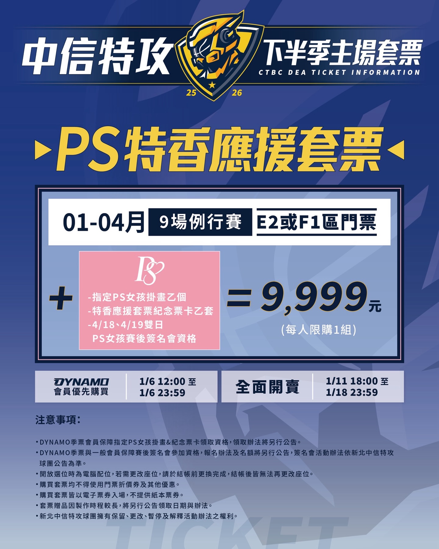 特攻下半季推出「PS特香應援套票」方案票價。圖片來源:新北中信特攻提供