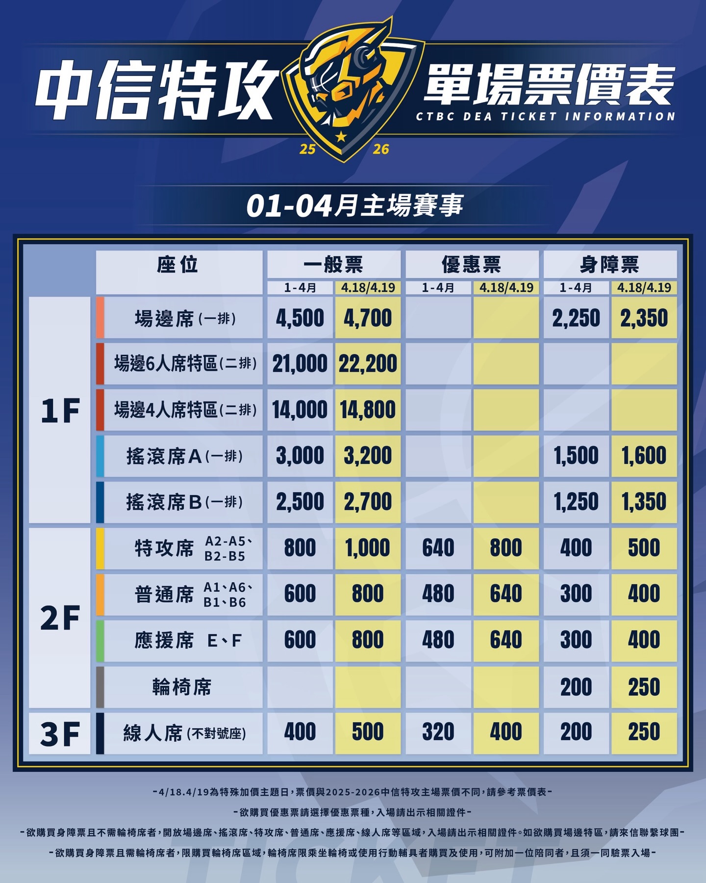 特攻下半季主場票價。圖片來源:新北中信特攻提供