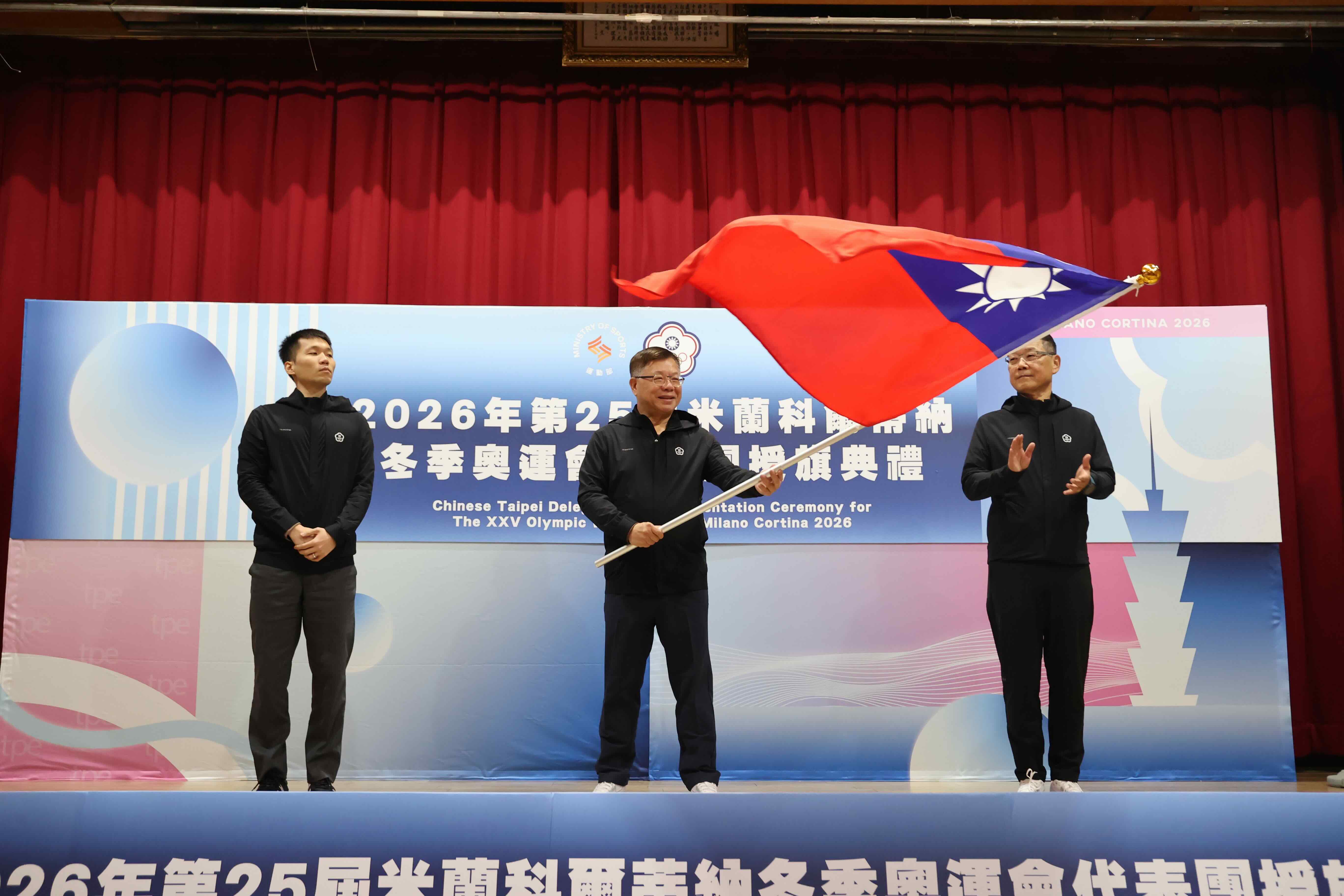 中華奧會與運動部於今天(22日)下午2時,假體育聯合辦公大樓3樓大禮堂舉行「第25屆米蘭-科爾蒂納冬季奧林匹克運動會」代表團授旗典禮。典禮由運動部部長李洋授旗並頒發加菜金,為即將出征的選手加油勉勵。