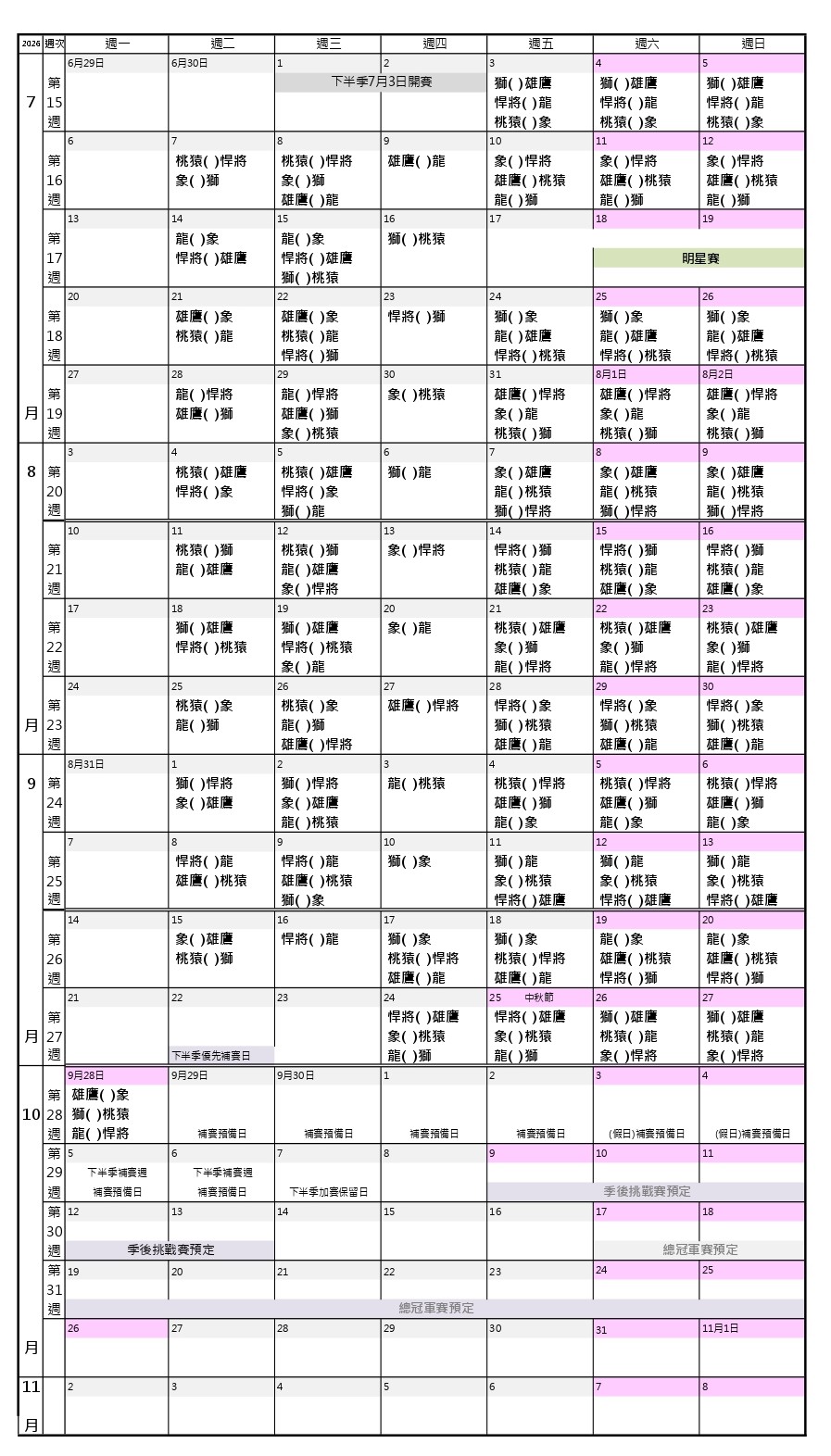 明星賽則是安排在下半季開打後的7月18、19日,季後挑戰賽預計自10月9日開打,台灣大賽則是10月17日開戰。