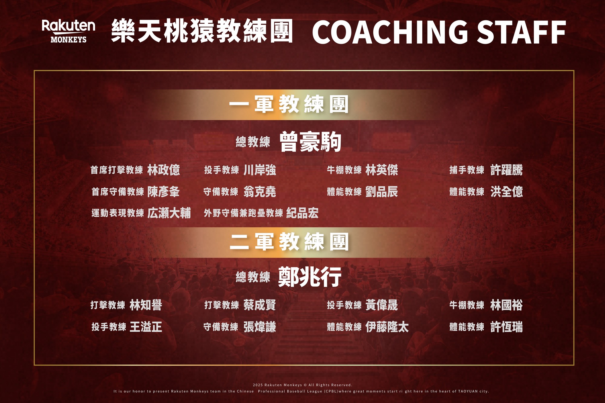 在新任總教練曾豪駒的帶領下,樂天桃猿隊教練團進行全面性調整。一軍方面,原一軍打擊教練林政億將出任為首席打擊教練,強化球隊攻擊端表現。同時,原二軍總教練陳彥夆則轉任一軍首席守備教練,負責整體守備指導與強化。此外,球隊新聘紀品宏擔任外野守備兼跑壘教練,提升外野防守與跑壘戰術執行能力。