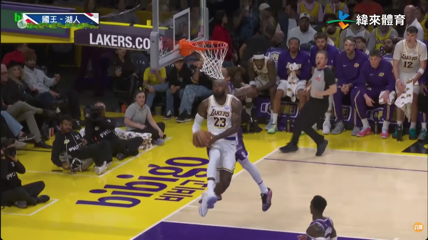 LeBron James秀了一次底線切入雙手拉桿反扣。圖片來源:緯來體育台