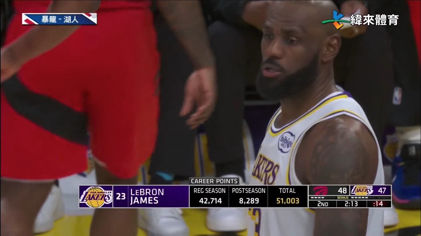 NBA快訊》詹皇達標生涯總得分51000分里程碑 湖人半場55比54領先暴龍